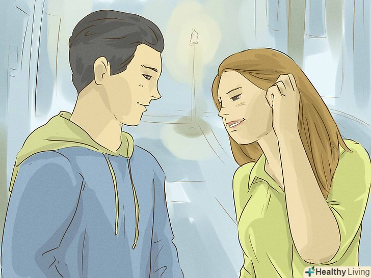 Підготуйтеся до поцілунку за допомогою легкого флірту. знайдіть привід доторкнутися до руки або долоні дівчини під час розмови. Зробіть комплімент очам або волоссю дівчини. Якщо ви знаходитесь досить близько, поверніться таким чином, щоб ваші коліна, ноги або руки стикнулися. Торкання допомагають подолати бар'єр незручності, який здатний перешкодити першому поцілунку. [5]- Можна зробити комплімент «з тобою так легко» або «не можу відвести погляд від твоїх очей».