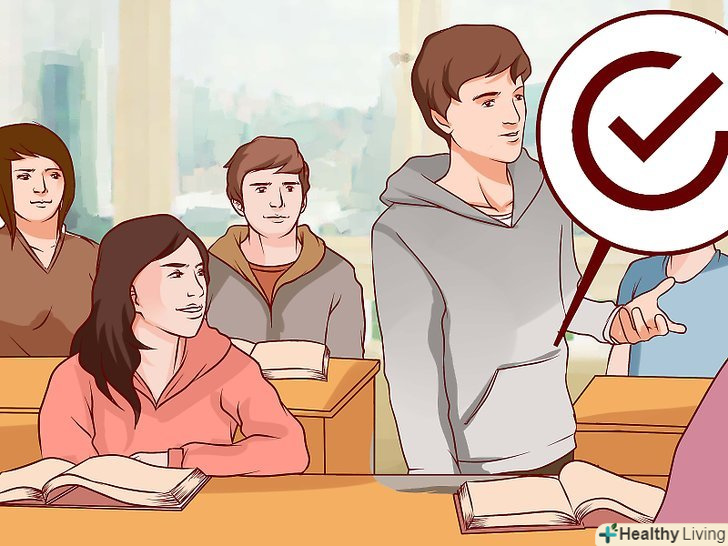 Активно беріть участь в заняттях. Якщо ви хочете привернути увагу дівчини, то вам необхідно виділитися під час уроку. Якщо тихо сидіти і робити записи, вас навряд чи помітять. Дуже важливо відповідати на запитання вчителя і задавати цікаві питання, щоб виділитися.- Не потрібно постійно приковувати до себе увагу. Якщо відповідати на занадто багато питань, то можна справити негативне враження.