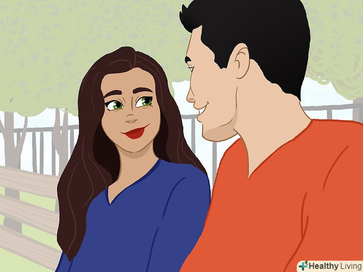 Сядьте або станьте поруч з хлопцем і доторкніться до нього, щоб показати, що вам з ним комфортно. Сядьте поруч з ним так, щоб ваші ноги стикнулися, доторкніться до його плеча або руці. Це дозволить йому зрозуміти, що ви зацікавлені в ньому і готові стати трохи ближче. [1]За допомогою мови тіла