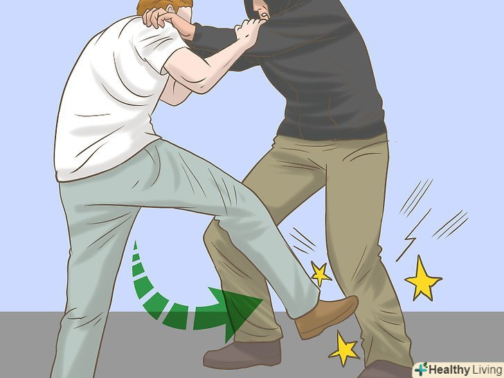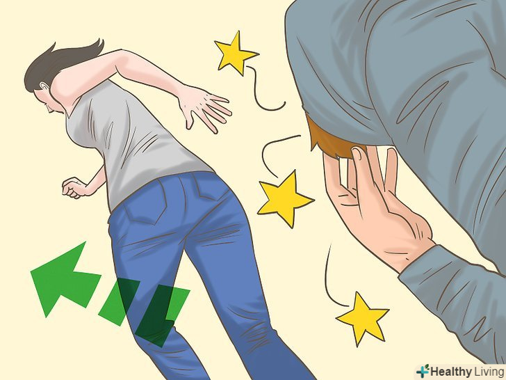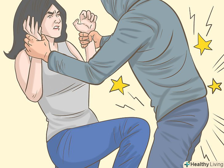 Наносите удари по чутливих ділянках начебтоГомілок і ступень, пахової області, горла і очей. пошкодження таких ділянок напевно спровокують достатню біль, щоб оглушити і зупинити викрадача. Цільтеся в ступні і пальці на ногах, намагайтеся роздряпати взуттям гомілку, нанести удар по горлу, схопитися за трахею або коліно, вдарити в пах або потрапити пальцями в очниці. [15]- Ваша мета — зовсім не взяти гору в бійці, а виграти час для втечі. Намагайтеся скоріше вирватися і тікайте з криками.