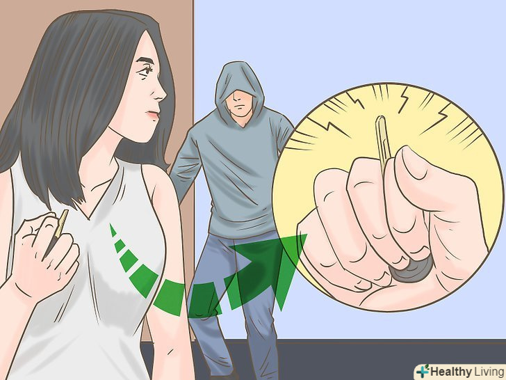 Нападайте на зловмисника з ключами або іншими предметами в руках. часто речі можна перетворити на зброю, тому Озирніться навколо і перевірте кишені. Ключами можна порізати людини, книги можна кидати в голову, а цеглини та інші предмети на тротуарі можуть серйозно травмувати зловмисника і допомогти вам втекти. [16]- Якщо ви на підборах, то можна зняти туфлі і перетворити взуття в зброю.