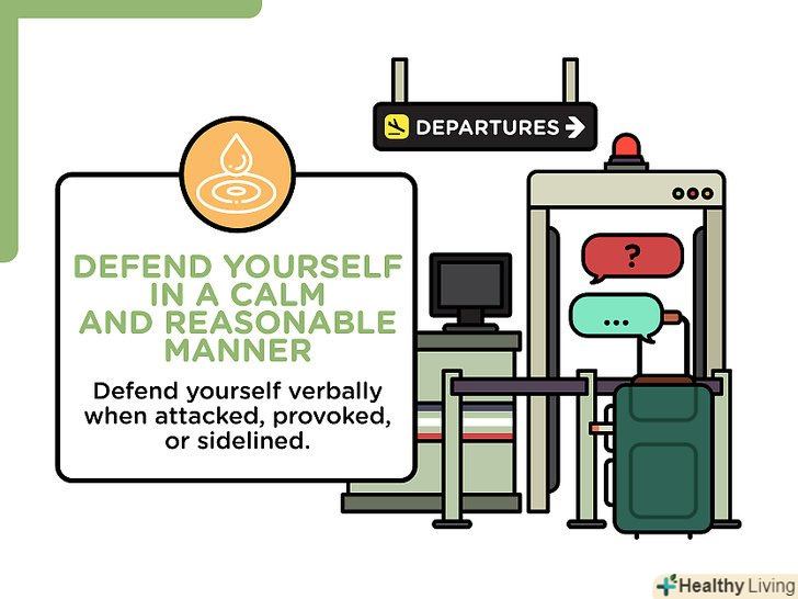 Захищайте свою позицію спокійно і грамотно. відбивайте словесні нападки; не давайте нападати на себе, провокувати або витісняти вас. Вмійте захиститися, коли вас намагаються вивести з себе, ігнорувати або навіть загрожують вам фізичною розправою.- Не стійте мовчки — набагато краще висловити те, що ви думаєте. Навіть якщо кінцевий результат залишиться незмінним, ви зможете довести собі та іншим, що ви не потерпите неповаги.