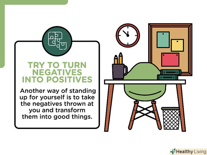 Спробуйте перетворити недоліки в гідності. здатність перетворювати негативні репліки на Вашу адресу в щось позитивне допоможе вам. Якщо ви почнете чинити таким чином з усіма нападками, ви побачите, що їх причиною, як правило, служить заздрість і невпевненість в собі. Наприклад:- Якщо хтось вважає, що ви багато командуєте іншими, сприймайте це як доказ того, що ви природжений лідер , що ви вмієте працювати з людьми і управляти проектами і прагнете до змін.