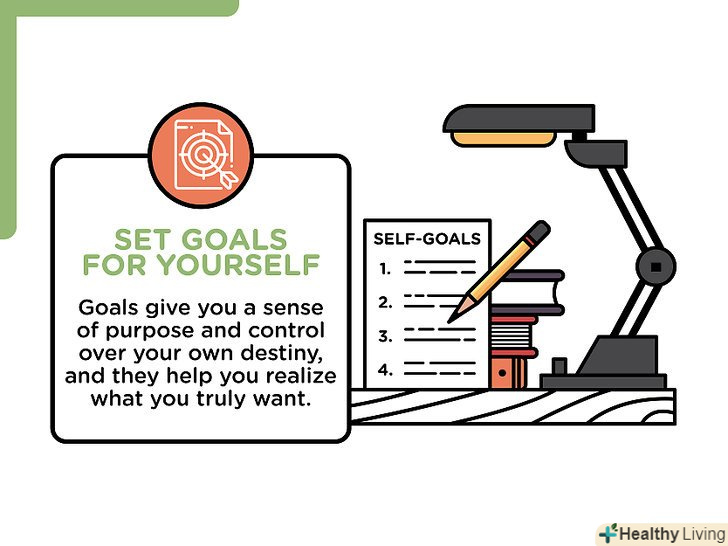 Ставте перед собою цілі. цілі дають нам відчуття важливості того, що відбувається, почуття контролю над власною долею і допомагають дізнатися, чого ми насправді хочемо. І це знання є важливою частиною вміння постояти за себе і не дати іншим людям витирати об себе ноги.- Мотивуйте себе амбітними, але досяжними цілями на кілька наступних тижнів, місяців або років. Метою може бути все, що завгодно: просування по службі, відмінні оцінки на навчанні, участь в марафоні. Важливо, щоб досягнення мети зміцнило вашу віру в свої можливості.