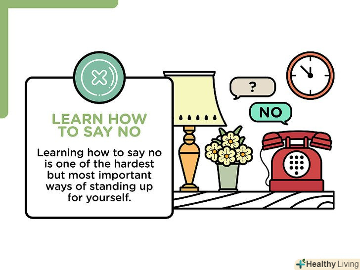 Почитайте літературу про те, як говорити «ні». навчитися відмовлятися — це один з найскладніших, але важливих кроків на шляху до захисту себе. Якщо ви з тих, хто завжди говорить " так " зі страху засмутити інших людей, ви ризикуєте стати людиною, про яку будуть витирати ноги і ким будуть користуватися.- Наприклад, якщо ваш начальник просить вас затриматися на роботі, коли ваш колега без проблем йде рівно о 18:00, відмовитися може бути дуже складно. Але якщо ця додаткова робота заважає вашому особистому життю і відносинам з близькими людьми, вам потрібно навчитися стояти на своєму. Не ставте інтереси чужих людей понад своїх-навчитеся говорити " ні " тоді, коли це необхідно.