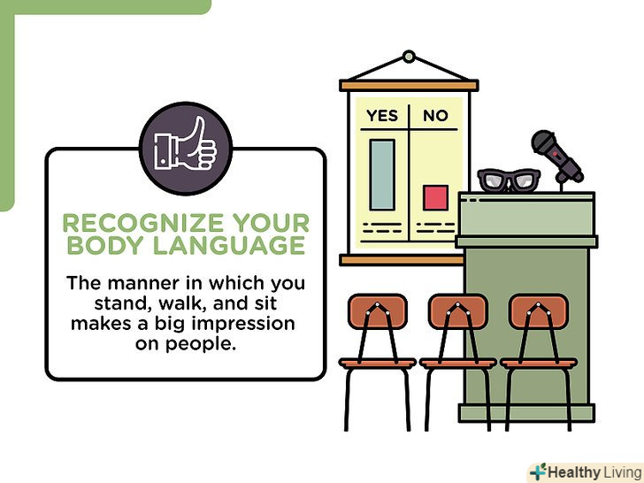 Слідкуйте за своїми невербальними знаками. те, як ви стоїте, ходите і сидите, повідомляє оточуючим певну інформацію. Позитивні знаки привернуть до вас повагу інших, згоду, довіра , а негативні знаки (сутулість, прагнення закритися і сховатися) — це практично пропозиція користуватися вами.- Відкриті знаки покажуть людям, що Ви впевнені в собі і що ви не дасте себе в образу. До відкритих знаків відносяться нахили вперед до мовця, зоровий контакт, поза з руками на талії і розставленими ногами, повільні і чіткі жести, розворот корпусом до людини при зустрічі. Не варто схрещувати руки або ноги.