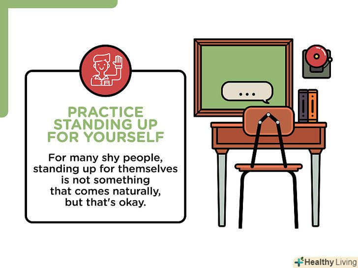 Тренуйтеся захищати себе. багатьом сором'язливим людям це дається складно, але це нормально. Потрібно більше тренуватися, і незабаром ви станете рішучіше, а до вашої думки почнуть прислухатися.- Можливо, ви відмовляєтеся захищати себе лише тому, що ви не можете вимовити те, що потрібно сказати в певний момент. Запишіть можливі фрази для складних ситуацій і тренуйтеся вимовляти їх, використовуючи таймер.