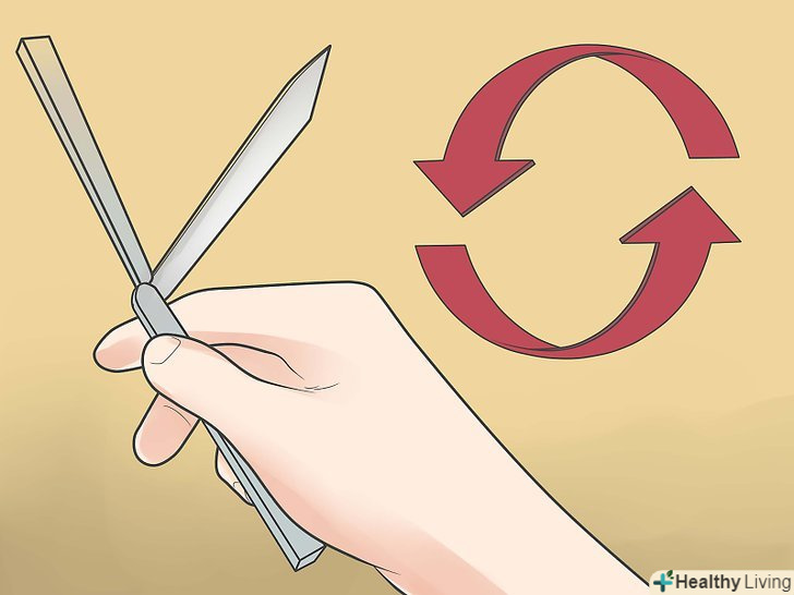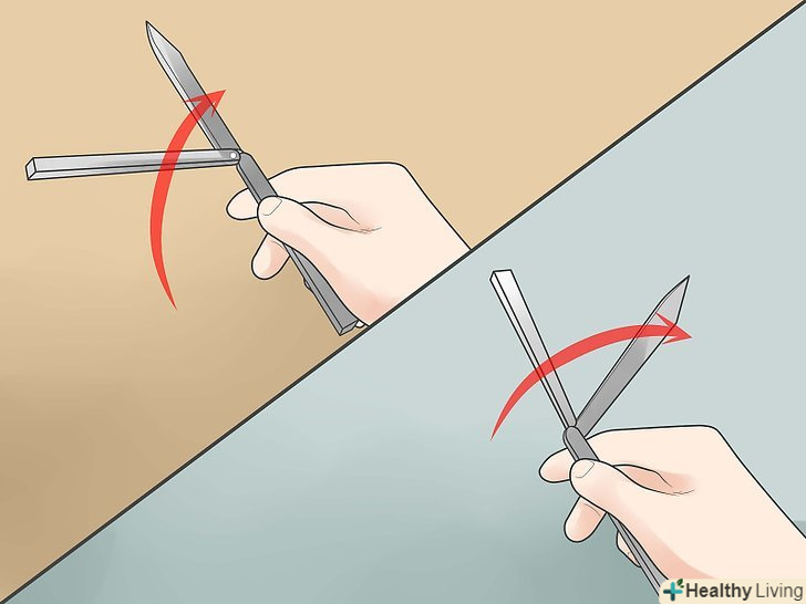 - Якщо ви намагаєтеся зробити це з справжнім ножем-метеликом, з обережністю дотримуйтесь кроку 5. Якщо ви неправильно обертаєте ніж при його закритті, лезо може порізати задню сторону вашого вказівного пальця. Рекомендується практикувати ці рухи з тупим лезом. Як тільки освоїте це, беріть ніж з лезом гостріше.