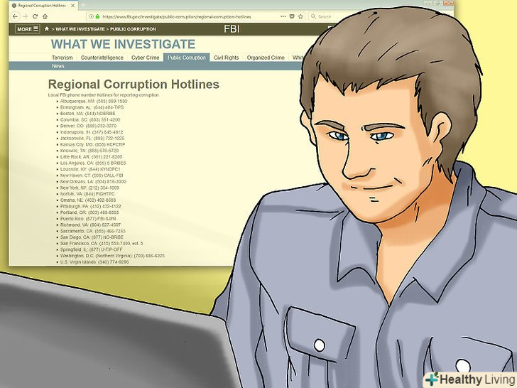 Щоб повідомити про факт корупції в організації, скористайтеся спеціальною гарячою лінією. якщо ви підозрюєте, що у вашій компанії є корупціонери, скористайтеся цією гарячою лінією, створеною в 2003 році у зв'язку з розслідуванням подій, пов'язаних з компанією Epson, і зателефонуйте за номером 1-888-622-0117. [8] до юрисдикції ФБР відноситься розслідування: [9]- Фальсифікації фінансових відомостей, підроблення даних, недобросовісна торгівля з метою роздути дохід або приховати збиток, тіньові транзакції