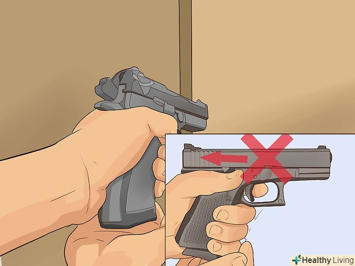 Більшість напівавтоматичних пістолетів не стріляє, якщо затвор не знаходиться в крайньому передньому положенні. це перетворюється на проблему, коли пістолет притиснутий до чого-небудь або коли передня частина пістолета притиснута до чогось м'якого. Проста вправа, яка допомагає утримувати поганих хлопців подалі від вашого пістолета під час бою в приміщенні, – це тримати зігнуту під кутом 90 градусів допоміжну руку перед грудьми. Це допоможе утримати поганого хлопця на відстані в той час, як ваша рука з пістолетом буде опущена біля стегна. Для тренування: підійде висока мішень, на яку ви можете спертися рукою і вистрілити (мішень обов'язково повинна бути м'якою, щоб куля не зрикошетила і не розкололася — стріляйте строго вперед, щоб не потрапити собі в руку). Пари тренувань буде достатньо, ви повинні отримати уявлення про техніку.