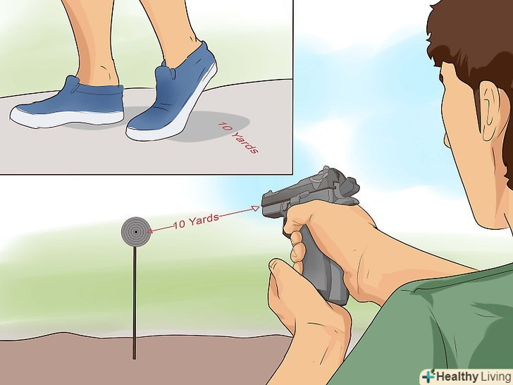 Практикуйтеся в русі . у русі ви повинні потрапляти по цілям з 9 метрів. Встановіть три або більше цілей на відстані кілька метрів один від одного. Починайте за 15-18 метрів. Вихоплюючи пістолет, підбігайте до точки вогневої позиції, розташованої на відстані 9 метрів (від вашої першої мети). Зробіть серію з двох пострілів, зробіть приставний крок, щоб стріляти по наступній меті, і т. д. кожен раз, пробігаючи смугу, намагайтеся виконувати всі дії швидше; намагайтеся робити якомога менше пауз при стрільбі (навіть в русі у вас повинно виходити виконувати Миттєве прицілювання ). Чим довше будуть паузи, тим точніше ви будете потрапляти в ціль, але в перестрілці час йде набагато швидше, ніж на стрільбищі.