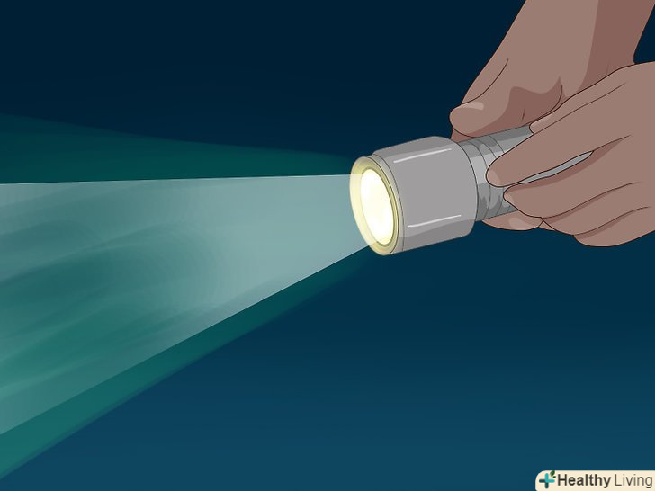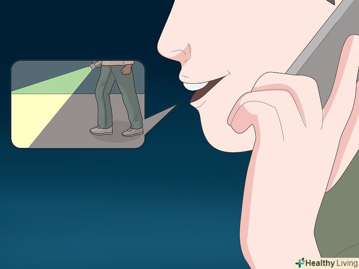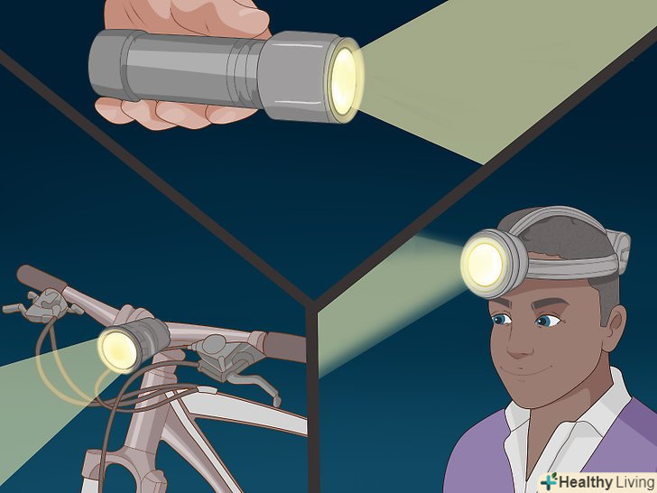 Увімкніть ліхтарик. ліхтарик або світло від велосипеда-відмінний засіб, який варто використовувати, коли ви змушені перебувати на вулиці в нічний час. Навіть якщо ваш маршрут пролягає по освітлених вулицях, ви все одно можете проходити по неосвітленій території. В цьому випадку вам може допомогти ліхтарик. [5]- Використовуйте ліхтарик, який надівається на голову, щоб ваші руки залишалися вільними.