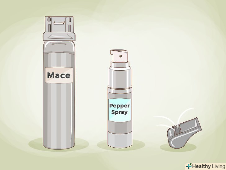 Носіть з собою засіб особистого захисту. ви можете носити з собою свисток, перцевий аерозоль або балончик зі сльозогінним газом. Свисток дозволить іншим дізнатися, що щось не так, а гучний шум стримає потенційних зловмисників. При правильному використанні перцевого аерозолю або балончика зі сльозогінним газом ви зможете виграти час і звернутися за допомогою. [4]- При використанні перцевого аерозолю або балончика зі сльозогінним газом переконайтеся, що отвір звернено від вас і направлено на нападника.