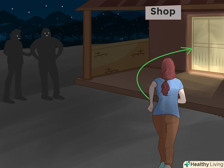 Змініть маршрут, якщо помічаєте підозрілих людей. якщо ви бачите підозрілу людину, що йде вам назустріч або наступного за вами, негайно змініть свій маршрут. Поверніть на іншу вулицю, щоб змінити свій маршрут. Завдяки цьому ви зможете попередити напад зловмисника. [10]- Якщо ви бачите, що хтось стежить за вами, прямуйте в місце, де ви будете в оточенні людей, наприклад, на автозаправну станцію, в магазин або ресторан. Не йдіть до машини або до свого будинку, якщо поблизу нікого не буде.