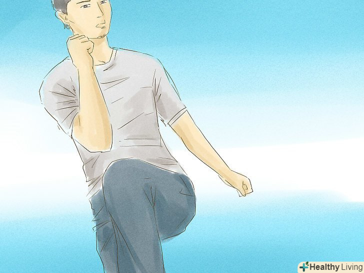 Продовжуйте рухатися. Тримайте руки поруч з обличчям-так ви зможете відхилити удари, але не забувайте рухатися, так як це ускладнить противнику завдання. Чим більше ви будете рухатися, тим важче йому буде потрапити кулаком вам в обличчя або шию. [14]- Ваші ноги повинні бути в русі, як ніби ви потрапили на гаряче вугілля, а голову слід нахиляти і вивертатися, як ніби на вас зараз обрушиться стеля — це допоможе уникнути ударів.
