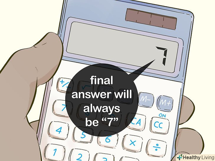 Заявіть, що на екрані калькулятора відображається число 7. Скажіть це аудиторії, не дивлячись на екран калькулятора. Попросіть добровольця показати екран аудиторії, щоб підтвердити, що Ви маєте рацію. [14]- Фокус можна переграти. Для цього попросіть добровольця розділити результат на 7 в кроці 3, а потім на останньому кроці заявіть, що на екрані калькулятора відображається число 13.