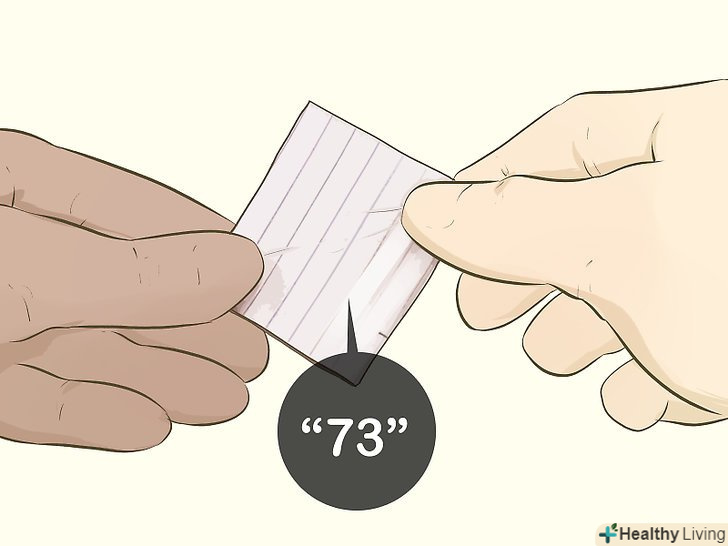 Напишіть число " 73 " на аркуші паперу, складіть його і віддайте добровольцю. нікому не показуйте написане число. Ви розкриєте це» секретне " число в кінці фокусу. [5]- Неважливо, який папір використовувати. Просто складіть її так, щоб ніхто не побачив число.