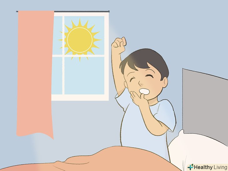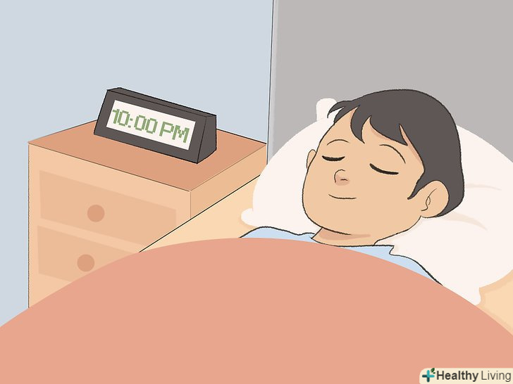 Лягайте спатиЯк мінімум за вісім годин до пробудження. організуйте розпорядок так, щоб спати хоча б 8 годин щоночі. Встановлюйте будильник на один і той же час щоранку, щоб влитися в графік. [5]- Це означає, що якщо вам потрібно встати о 7:00 ранку, вам слід лягти спати не пізніше 23:00. Майте на увазі, що якщо ви зазвичай довго засинаєте, вам потрібно буде врахувати це і лягти спати ще раніше.