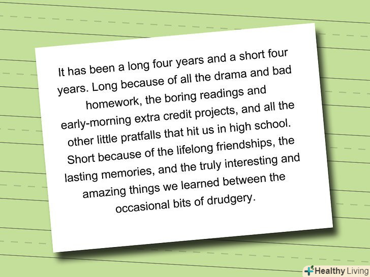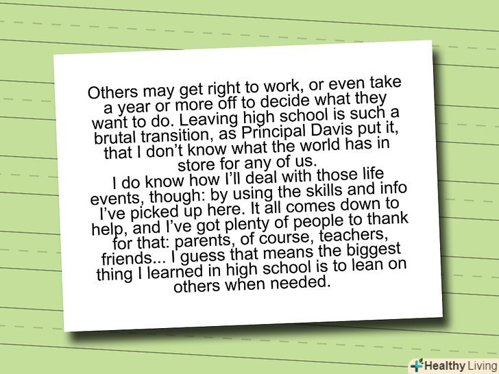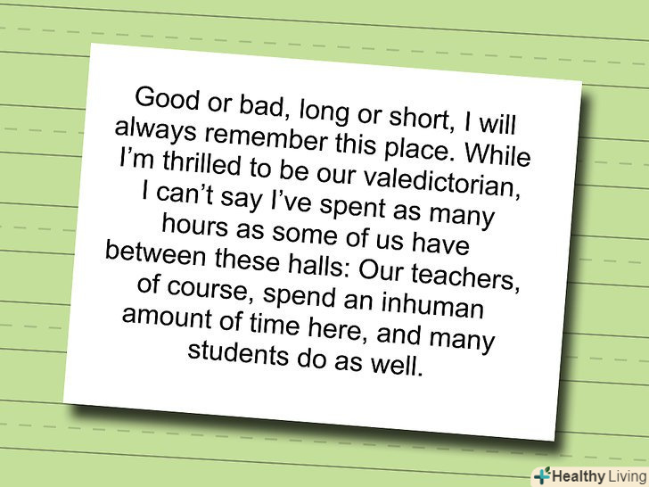Подумайте про те, чого вам буде не вистачати після закінчення навчання. Перерахуйте навіть дрібні деталі (наприклад, ваш улюблений соус в їдальні або колір приміщень). Включіть ці моменти в свою промову.