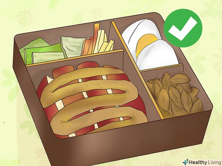 Підготуйте обід. важливо, щоб у студента був упакований здоровий і смачний обід, коли він йде в школу. Таким чином, вони не їдять їжу з автоматів або в кафетерії; в них багато калорій і мало поживних речовин. Якщо ви студент, розробіть собі здоровий раціон харчування, або якщо ви батько, переконайтеся, що ви упакували дитині продукти з поживними речовинами.