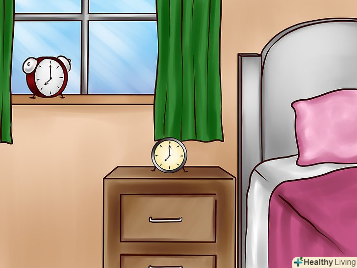 Ускладніть собі можливість подрімати після дзвінка будильника. слід визнати, що багато людей вранці відкладають дзвінок будильника на трохи більш пізній час (часом навіть по кілька разів поспіль). Однак такі дії лише ускладнюють ранкове пробудження і потім призводять до більш напруженої поспіху. Тому відразу поставте будильник так, щоб ви не могли дотягнутися до нього з ліжка.- Якщо ви прокидаєтеся з великими труднощами, спробуйте поставити будильник на іншому кінці кімнати, щоб Ви були змушені вибратися з ліжка і вимкнути його. [19]