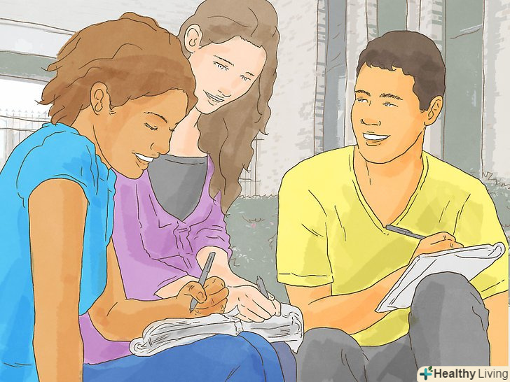 Працюйте над домашнім завданням. у великій групі кожен вносить свій внесок в отримання правильних відповідей і якнайшвидше виконання завдання. Робіть це в безпечному місці, наприклад, у кого-небудь вдома або в автобусі по дорозі додому. Ніколи не займайтеся цим у класі.- Розподіліть питання серед усіх учасників групи, щоб зробити домашнє завдання швидше. Нехай хтось робить перші п'ять, інший-наступні п'ять, і так далі. Можна закінчити завдання до закінчення поїздки в автобусі. Намагайтеся зберігати коло учасників групи найбільш вузьким.