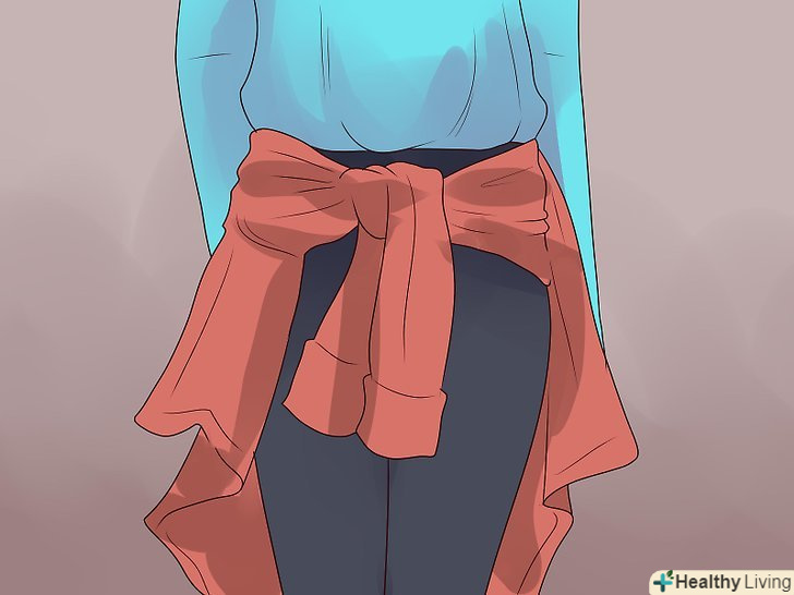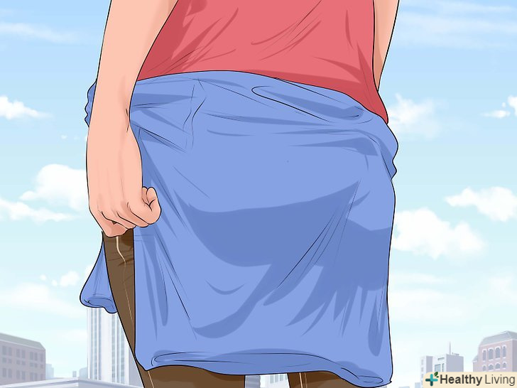Оберніть куртку навколо талії, якщо це необхідно. якщо є можливість, оберніть футболку, кофту або куртку навколо талії, особливо якщо ви підозрюєте, що кров просочилася через одяг. Так ви зможете приховати плями, поки у вас не з'явиться можливість змінити одяг.- Перші місячні зазвичай не такі рясні, тому, швидше за все, ви відчуєте їх наближення, перш ніж кров просочиться через одяг. Проте подбайте про» проблему " якомога швидше, щоб уникнути кровотечі, яке може принести масу незручностей. [8]