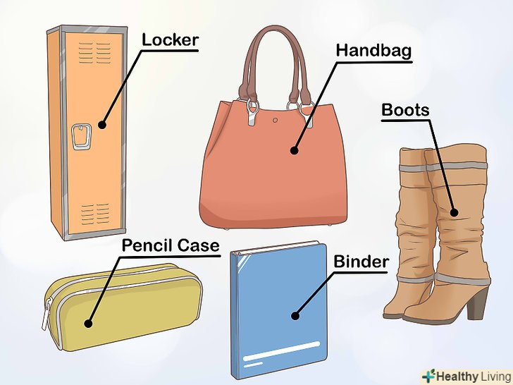 Знайдіть місце, де можна було б зберігати ваші гігієнічні приналежності. у них, звичайно, немає нічого ганебного, але якщо ви все ж чогось ніяковієте, то пошукайте місця, де можна було б їх зберігати. Втім, що довго шукати, якщо у вас є косметичка?! Якщо ж Статут школи не дозволяє ученицям носити косметички і сумочки, то і пенал згодиться, а то і навіть щось на зразок папки. Продумайте заздалегідь, куди ви покладете свій "запас", і коли настануть місячні, вам буде куди як легше і простіше. [2]- Якщо у вас є шафка, то і зовсім відмінно! Якщо замок надійний, то там можна зберігати річний запас засобів гігієни, а не носити їх з собою.