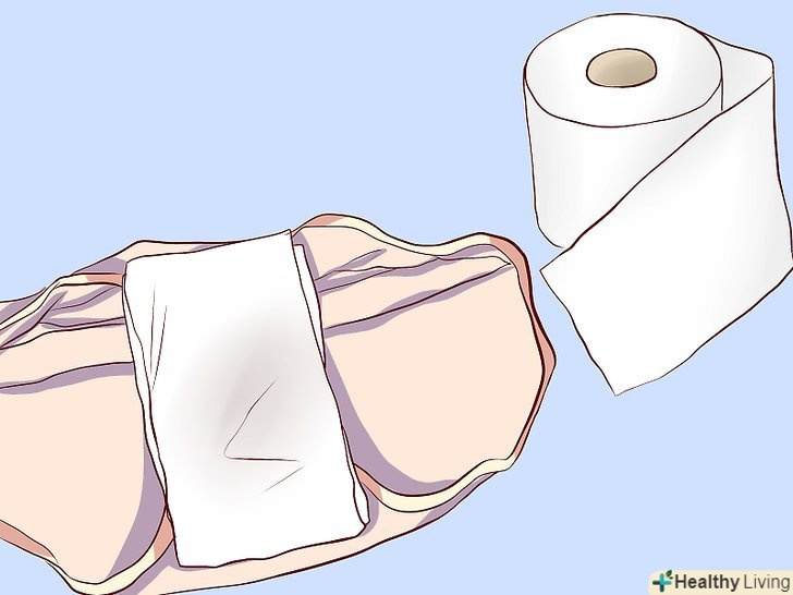 Зробіть прокладку самі, якщо це необхідно. якщо кращого варіанту все одно немає, а місячні вже ось-ось, то треба щось робити, а саме-саморобну прокладку. По суті, справа нехитра-вам потрібен довгий шматок туалетного паперу, досить довгий, щоб згорнути його не менше 10 разів навколо вашої долоні. Така товщина буде мінімально достатньою. Розмістіть цю імпровізовану прокладку у вашій нижній білизні так само, як і звичайну, а потім візьміть ще один довгий шматок туалетного паперу і оберніть його навколо тієї прокладки (перпендикулярно) ще 8-10 разів, поки все не буде надійно закріплено. В принципі, можете взяти ще один шматок туалетного паперу і повторити процедуру. Звичайно, зі звичайною прокладкою це не зрівняється, але все ж. [7]- В принципі, якщо у вас не такі вже й рясні місячні, то не варто пхати собі в нижню білизну цілий рулон — досить, скажімо, згорнути шматок туалетного паперу 2-3 рази. Втім, тут все суто індивідуально.