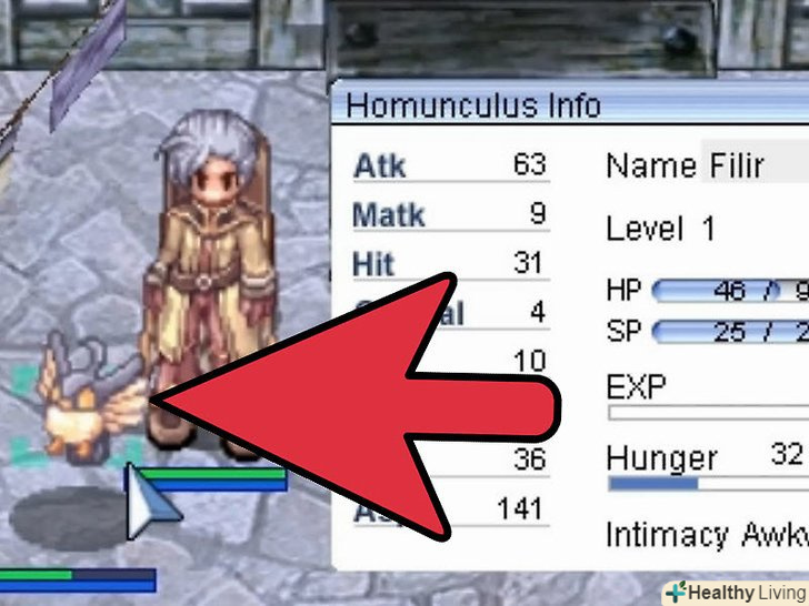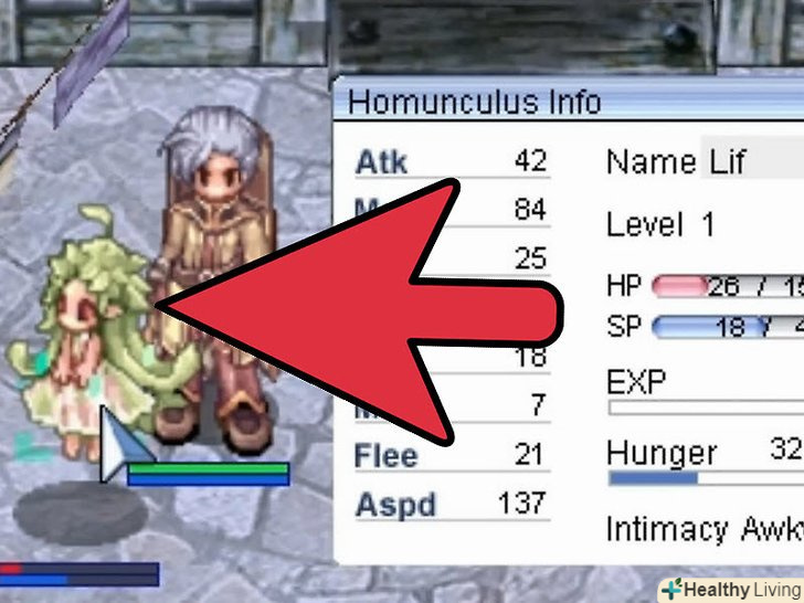 Покращуйте гомункула.Ваш гомункул може рости і в підсумку стати сильним супутником. Коли рівень близькості гомункула досягне показника Loyal, ви зможете еволюціонувати його за допомогою предмета Stone of Sage.- З еволюцією гомункул отримає випадковий бонус до однієї з характеристик, збільшення здоров'я, збільшення кількості SP, а також новий вигляд.