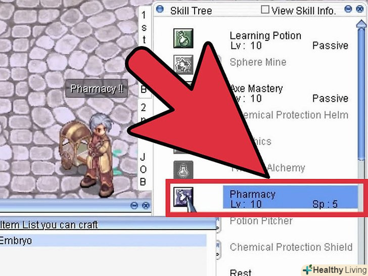 Створіть Embryo. щоб виготовити Embryo, застосуйте навик Prepare Potion разом з матеріалами, купленими в магазині матеріалів в місті Al de Baran.- Якщо у вас є всі необхідні навички, почніть процес з застосування навички Pharmacy. Ви побачите список з іменами доступних зілля. Серед них буде і зілля Embryo. Виберіть "Embryo «і натисніть» ОК", щоб створити його.