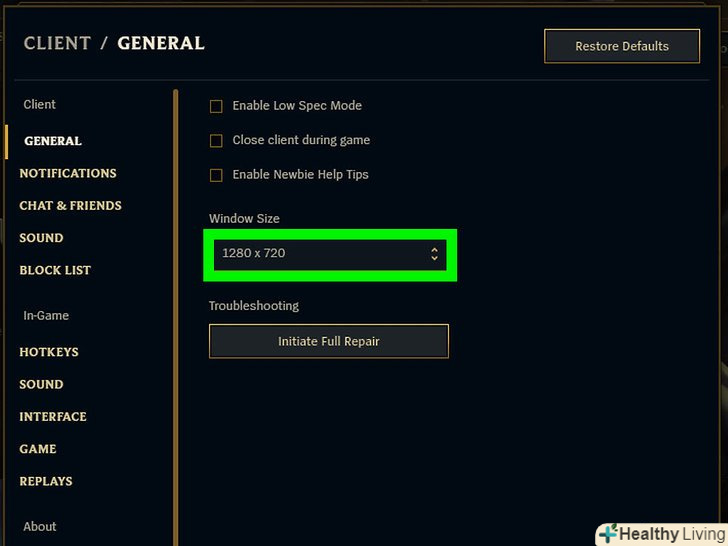 Більшість людей грають в League of Legends в повноекранному режимі, оскільки при цьому поліпшується продуктивність, але в певних обставинах віконний режим може виявитися краще — під час гри легше отримати доступ до інших вікон і програм, а продуктивність при цьому, хай і небагато, але підвищується, тому як при перемиканні з гри на робочий стіл продуктивність процесора знижується.[1] переключитися на віконний режим дуже просто.
