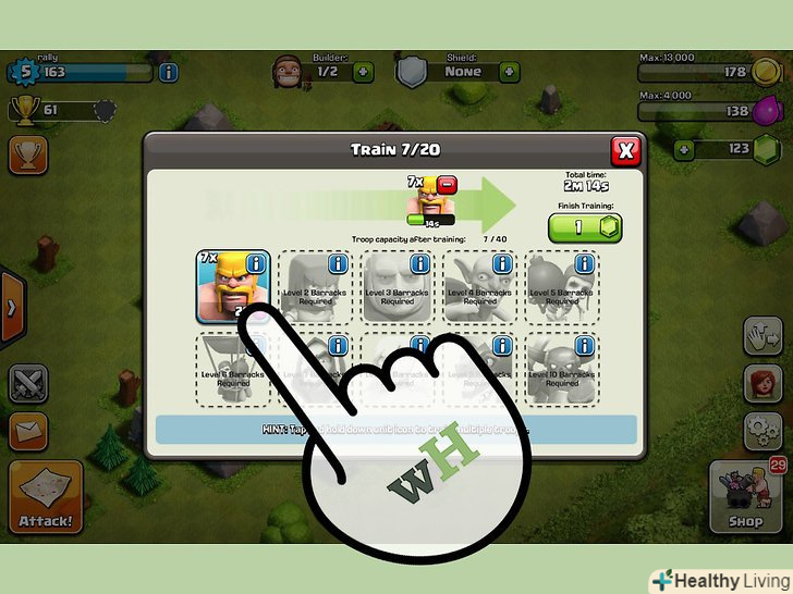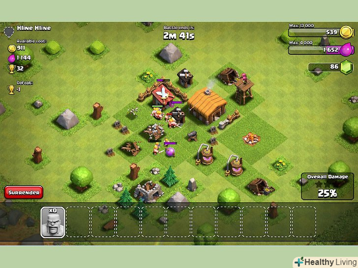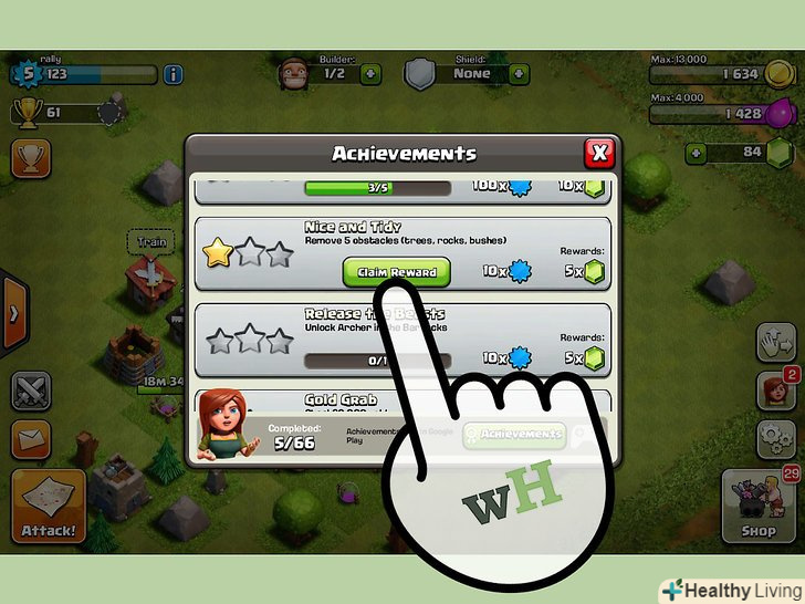 Виконуйте менш прибуткові досягнення.у грі є ряд різноманітних досягнень, які не пов'язані з битвами, за виконання яких ви також отримаєте якусь кількість самоцвітів. Ці досягнення можна отримати за поліпшення свого міста, але ви не отримаєте так багато самоцвітів, як за бойові досягнення. Виконуйте досягнення, прибираючи перешкоди, покращуючи ратушу, крадучи золото, відкриваючи таких юнітів, як Лучник або Дракон, а також пройшовши кампанію. [1]- За виконання цих досягнень ви зазвичай будете отримувати до 20 самоцвітів.