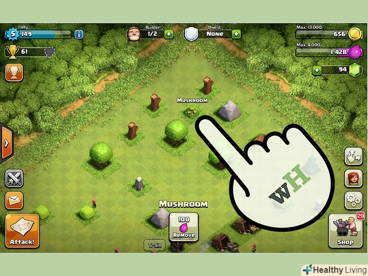 Знайдіть у своєму селі рослини і камені.це перешкоди, які необхідно прибрати для того, щоб на цьому місці можна було побудувати якусь будівлю. Коли ви тільки почнете гру, біля вашого села буде близько 40 таких об'єктів.- На видалення каменів витрачається золото, а на видалення рослин – еліксир.
