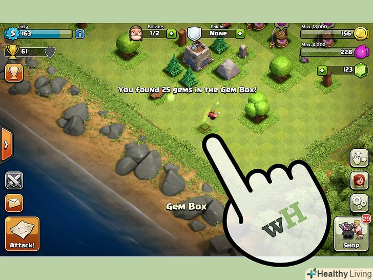 Погляньте на список досягнень.Clash Of Clans нагороджує вас за виконання певних цілей гри. За виконання цих досягнень Ви отримуєте нагороду, якою можуть бути і самоцвіти. Чим важче досягнення, тим більше самоцвітів Ви отримаєте.- Коли ви відкриєте вікно досягнень, ви побачите поточний прогрес доступних досягнень. Зосередьте свою гру на тому, щоб якнайшвидше виконати ці досягнення.