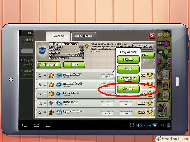 Позбавляйтеся від придурків, що потрапили в ваш клан.Clash Of Clans повинна бути веселою і раз вже ви створили свій клан, то повинні бути впевнені, що в ньому виявляться веселі і вмілі гравці, а не купка невмілих тролів, які лише будуть тягнути всіх вниз. Якщо хтось набридає іншим членам, непослідовний або порушує правила, виженете його з клану.