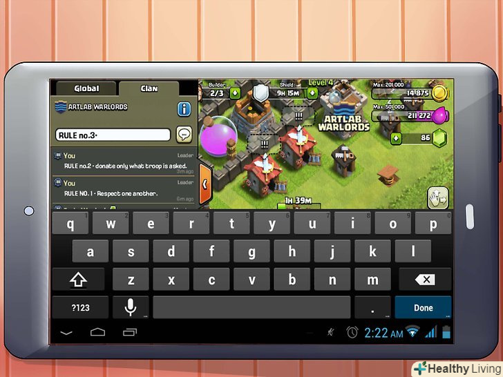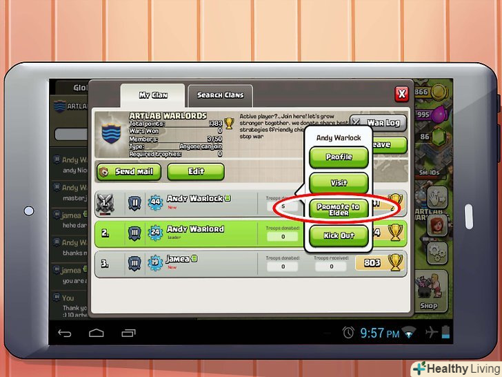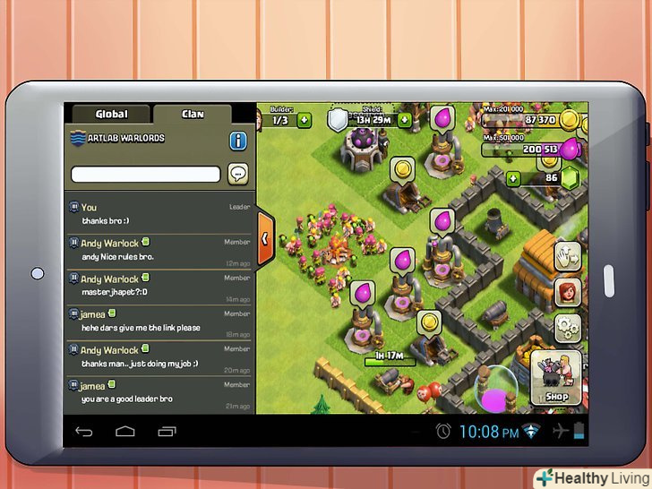 Будьте дуже активні в чаті.Будьте доброзичливі, обговорюйте правила клану і говорите на інші теми, наприклад про спорт. Попросіть всіх встановити додаток для отримання повідомлень, на зразок GroupMe, щоб дозволити всім обговорювати кланові війни без необхідності входу у внутрішньоігровий чат. Це може стати досить ефективним інструментом лідерства.- Не забувайте вислуховувати теми, які обговорюються в клані, особливо якщо вони походять від старійшин. Намагайтеся приходити до згоди, коли це можливо, але не забувайте що останнє слова завжди залишається за вами.