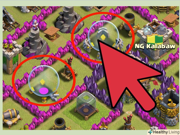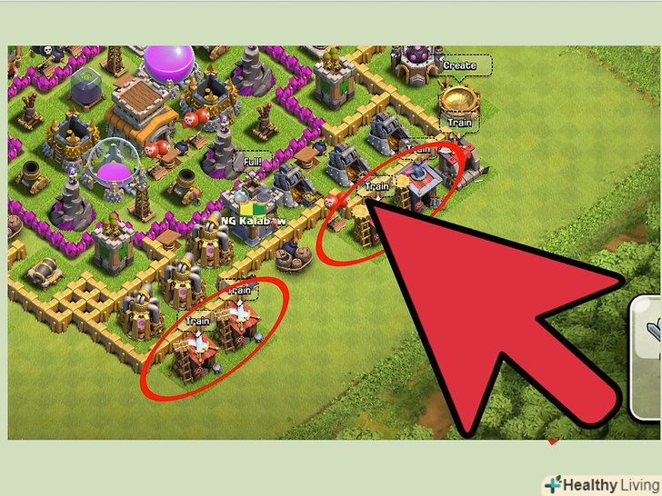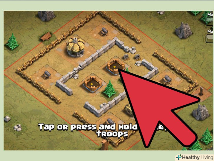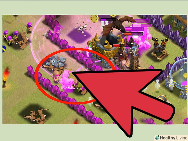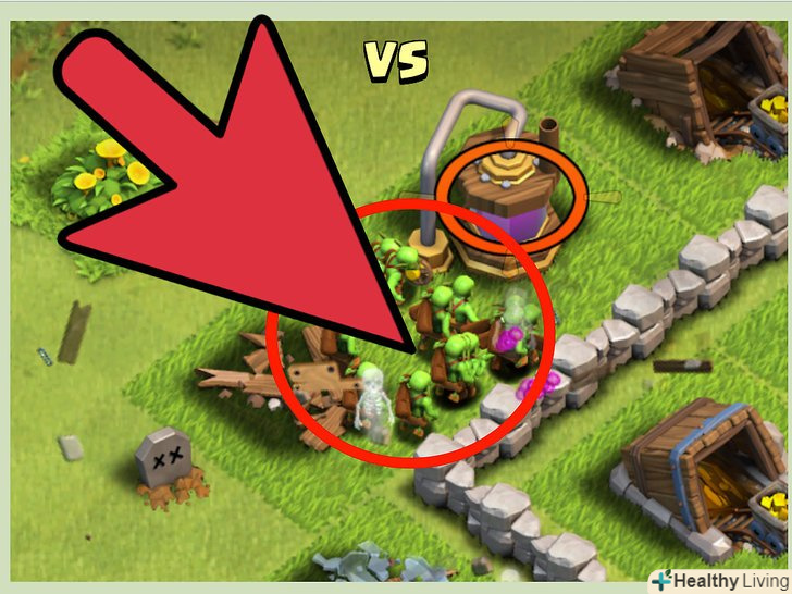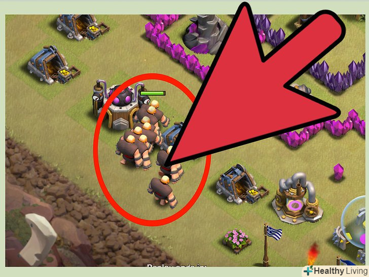 Виводьте війська потроху.відправляйте війська в групах по п'ять Чоловік або близько того, щоб мінімізувати ефект мортир і веж чаклунів, які можуть посіяти хаос у великих групах.[3]- Використовуйте гігантів для відволікання уваги, так як вони можуть увібрати багато шкоди.