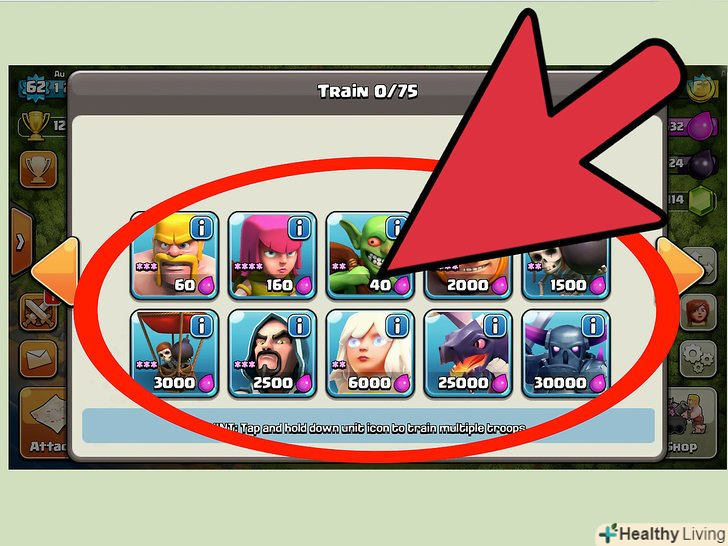 Підберіть хороший склад військ.думки сильно розходяться з приводу того, який склад армії найкраще підходить для фармінгу, але в основному вам знадобиться комбінація з гоблінів, лучниць, варварів, гігантів і стенобоїв.- Гіганти дороги, тому варто додавати хіба що парочку.