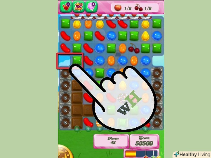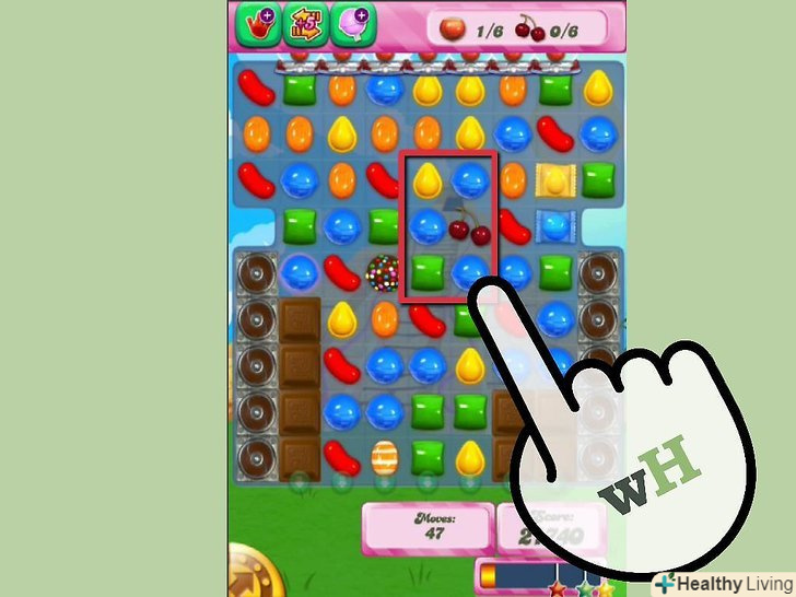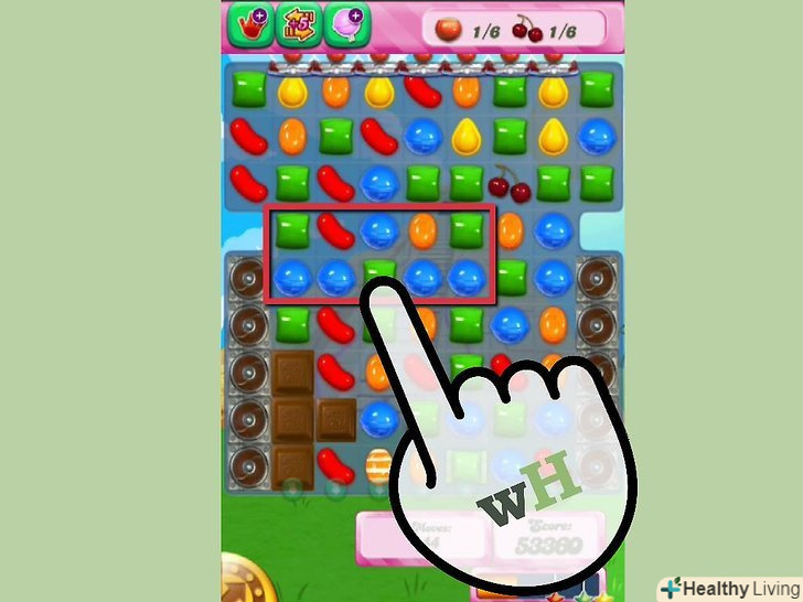 Зберіть набори з трьох або більше однакових цукерок. Суть гри, це пересувати цукерки в будь-якому напрямок (головне, щоб вони не були заблокованими), щоб створити набори з трьох або більше однакових цукерок. Коли ви збираєте цукерки, вони розіб'ються і їх замінять цукерки над ними, щоб ви могли досягти мети кожного рівня. Якщо ви зберете більше ніж 3 однакові цукерки, ви зробите цукеркову комбінацію. Це сильні дроблення цукерки, які ви можете використовувати кількома способами.- Якщо ви збираєте 4 цукерки, ви створите спеціальну цукерку, яка розтрощить цілий ряд, якщо вона виявиться частиною набору з трьох цукерок або більше.