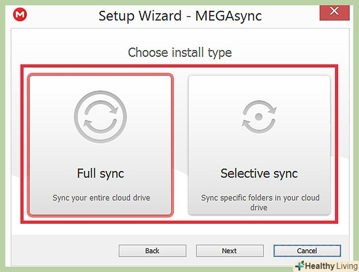 Виберіть тип установки.підтвердивши аккаунт, виберіть тип установки:» повна синхронізація «або»Вибіркова Синхронізація".- "повна синхронізація" синхронізує весь Хмарний диск з комп'ютером. "Вибіркова Синхронізація" синхронізує лише вибрані папки.