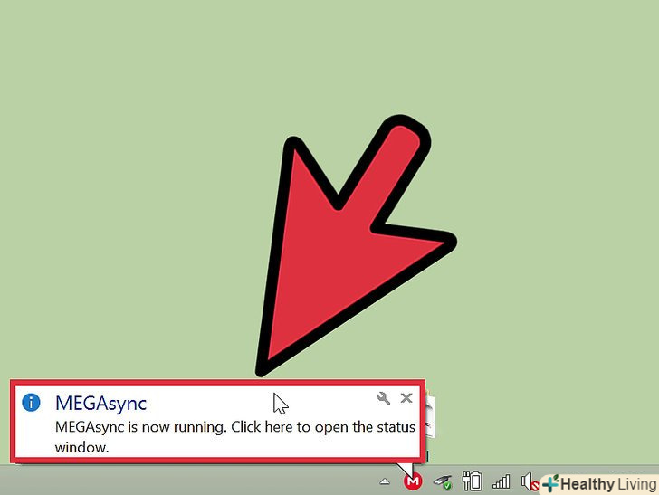 Синхронізуйте файли. поки клієнт працює, його можна знайти на панелі повідомлень в правому нижньому кутку робочого столу. Його можна дізнатися по логотипу у вигляді букви М в червоному колі. Поки клієнт працює, він буде автоматично синхронізувати всі файли в локальній папці MEGA або на хмарному диску.