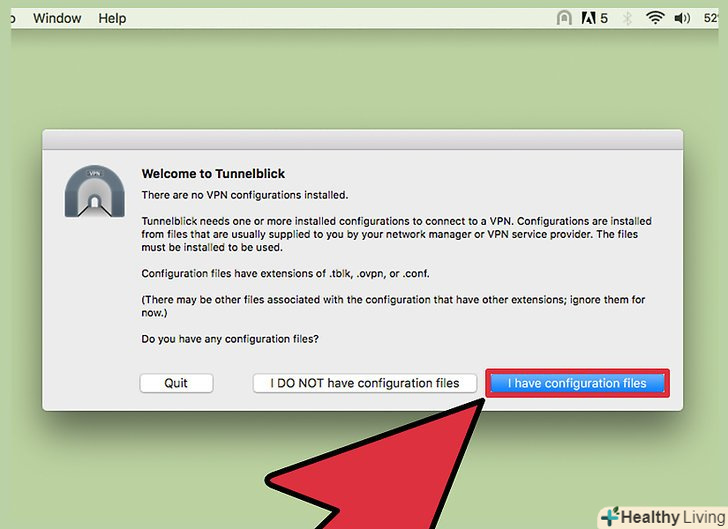Запустіть Tunnelblick.завантаживши файли конфігурації, запустіть Tunnelblick. Клієнт запропонує вам вибрати файли конфігурації. Натисніть " i have configuration files "(У мене є конфігураційні файли) – «OpenVPN Configuration (s)» (конфігурація OpenVPN). Якщо файли конфігурації призначені для Tunnelblick, замість «OpenVPN Configuration(s)» (конфігурація OpenVPN) виберіть опцію «Tunnelblick VPN Configuration(s)» (конфігурація TUNNELBLICK VPN).- Натисніть " Open Private Configurations Folder "(відкрити папку з приватними конфігураціями). Відкриється нове вікно Finder.