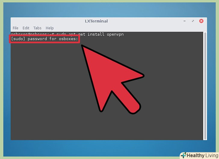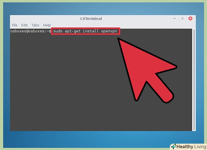 Встановіть OpenVPN-клієнт.він необхідний для підключення до OpenVPN-серверів. Такий клієнт можна завантажити з репозиторіїв більшості дистрибутивів Linux. Описаний тут процес розрахований на користувачів Ubuntu та інших дистрибутивів Debian, але, швидше за все, застосуємо і до інших дистрибутивів Linux.- Відкрийте термінал і введітьsudo apt-get install openvpn. Перед установкою клієнта введіть пароль адміністратора.