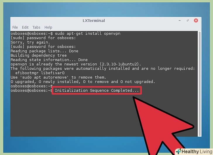 У терміналі запустіть OpenVPN-клієнт. Відкрийте термінал. Якщо ви помістили конфігураційні файли в каталог Home, то міняти директорію не потрібно; в іншому випадку в терміналі перейдіть в каталог, в якому зберігаються файли конфігурації. Для запуску OpenVPN-клієнта введіть команду:- Openvpn --configconfigFile.ovpn