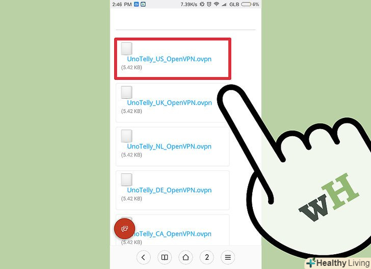 Скачайте файли конфігурації сервера.такі файли можна знайти на сайті будь-якого VPN-сервісу. Одним з файлів, можливо, буде файл із сертифікатом безпеки, а інший включатиме інформацію про сервер. Якщо VPN-сервіс надає доступ до безлічі серверів, конфігураційних файлів буде кілька.[1]- Файли конфігурації можна завантажити на сторінці підтримки користувачів обраного VPN-сервісу. Можливо, конфігураційні файли будуть упаковані в архів (zip-файл).