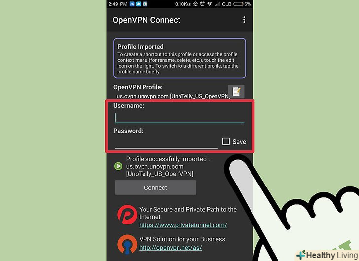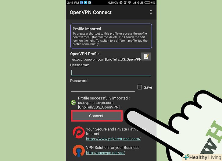 Для підключення до VPN-сервера натисніть " Connect "(підключитися).система Android скористається конфігураційним файлом, щоб підключитися до VPN-сервера. Перевірте підключення; для цього визначте ваш публічний IP-адреса-він повинен збігатися з IP-адресою VPN-сервера.[6]