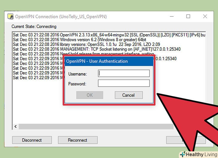 Введіть облікові дані.введіть ім'я користувача та пароль, надані VPN-сервісом. При введенні пароль не відображається.