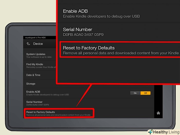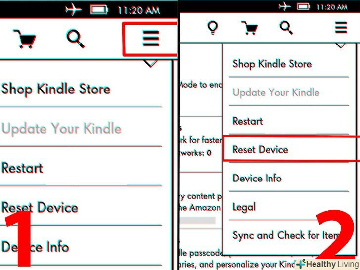 Повне скидання Kindle Paperwhite.на домашньому екрані натисніть "Меню". У спливаючому вікні натисніть "Налаштування". Поверніться у вікно "Меню «і натисніть»скидання пристрою". У вікні з попередженням натисніть "так«, щоб скинути налаштування пристрою до заводських (або натисніть» Ні", якщо ви не хочете цього робити).[16][17]