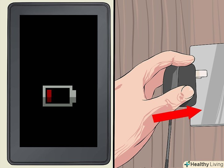 Зарядіть пристрій.це необхідно зробити до того, як приступати до м'якої перезавантаження або повного скидання. Підключіть пристрій до джерела живлення за допомогою кабелю, який поставлявся в комплекті з Kindle. Дочекайтеся повної зарядки акумулятора (значок зарядки акумулятора знаходиться у верхній частині домашнього екрану), а потім вимкніть Kindle від джерела живлення.[4]- Пам'ятайте, що повне скидання можна здійснити тільки в тому випадку, якщо батарея пристрою заряджена як мінімум на 40 %.